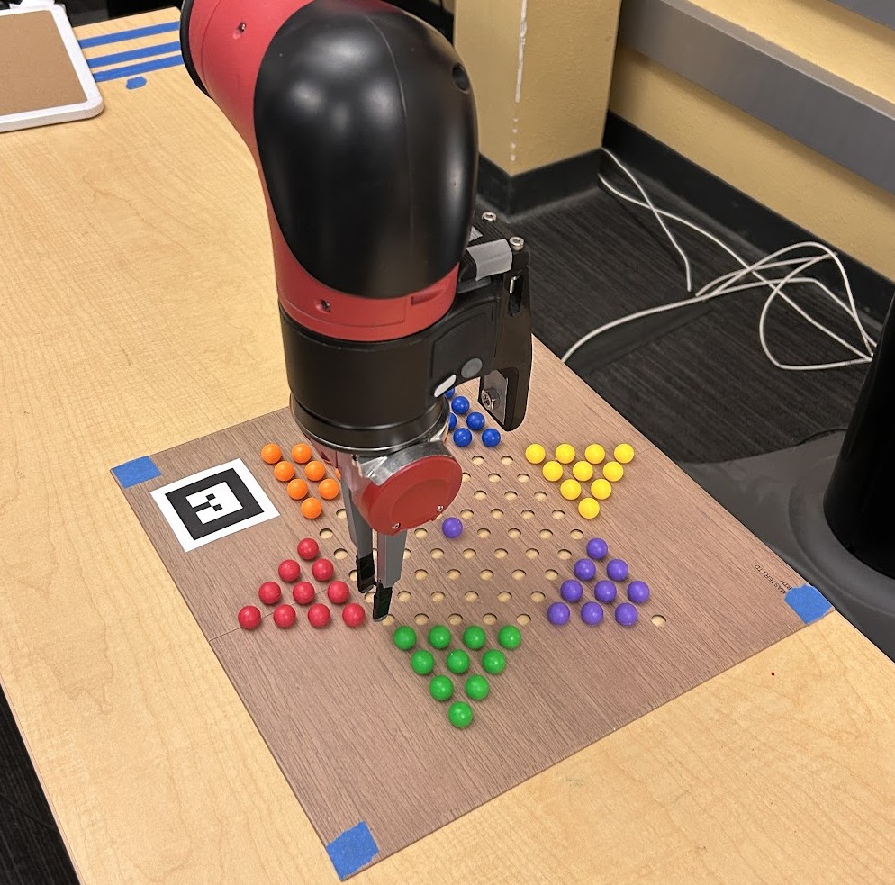 A Python and ROS-based Chinese Checkers system where a Sawyer robot autonomously detects, picks up, and places pieces using computer vision and AI with Minimax and Alpha-Beta pruning for real-time decision making.